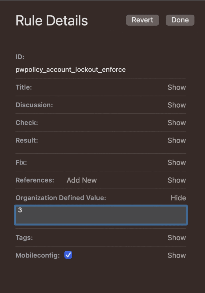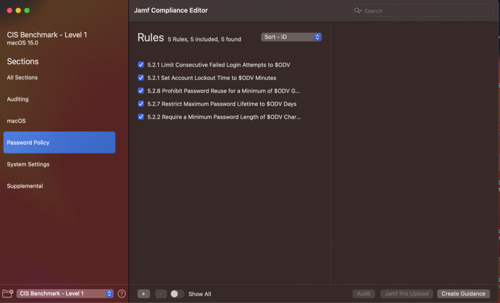 Above I am defining account lockout time to 3 from 5 which was default. Jamf recommends to keep default values perhaps because Level 1 are essential, practical security tips. It makes sense what jamf is telling; however, organization’s security baseline can differ significantly. In the Jamf Editor, it is possible to include Level 2 security guidelines by clicking “showing all”.